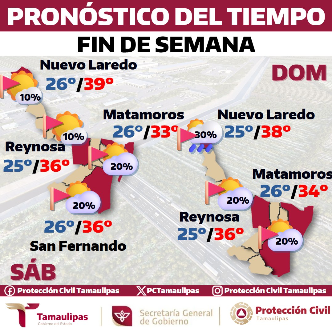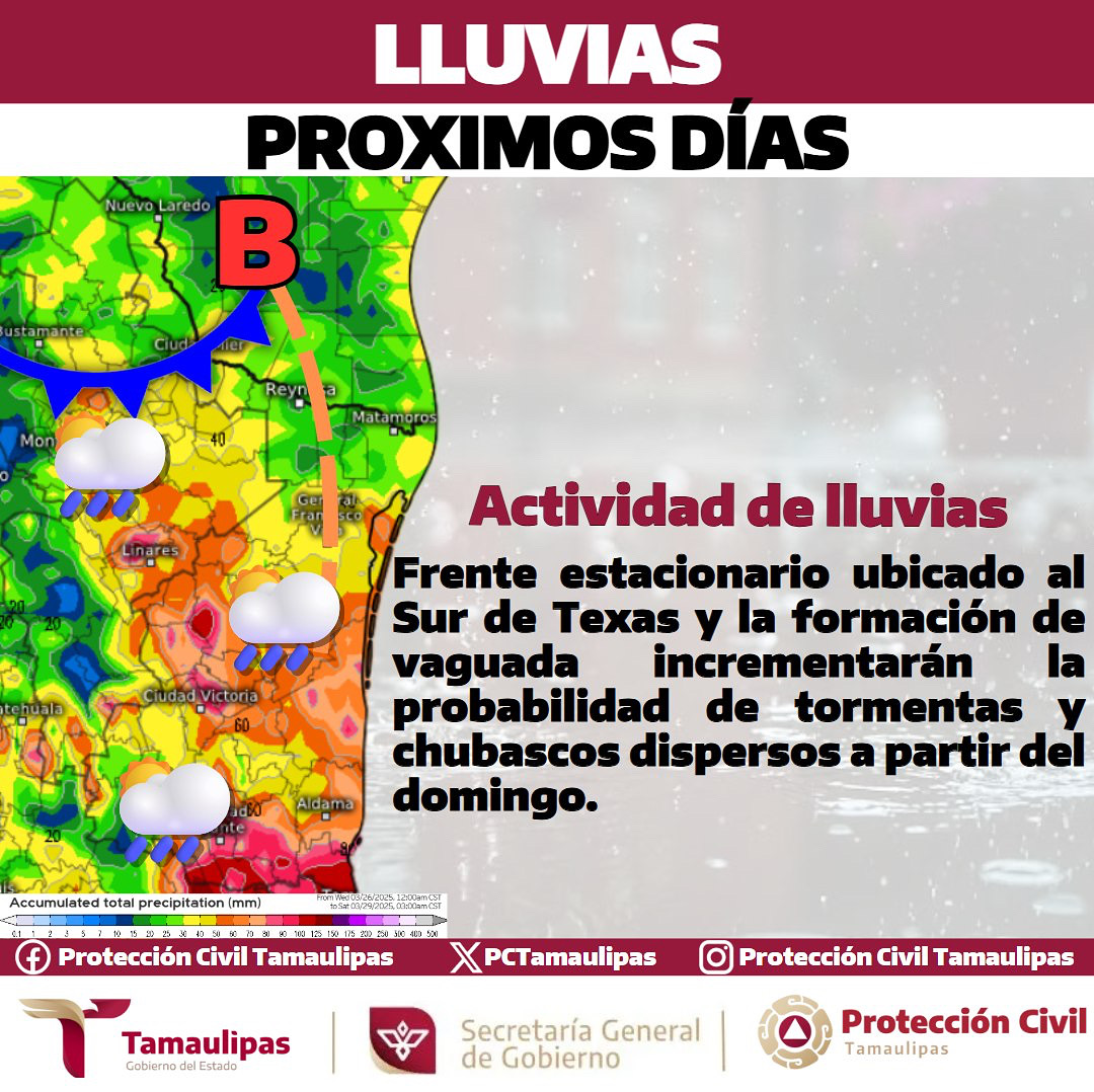 La actividad de lluvias incrementará en Tamaulipas a partir del miércoles-jueves; probables eventos fuertes a intensos, debido a la llegada…