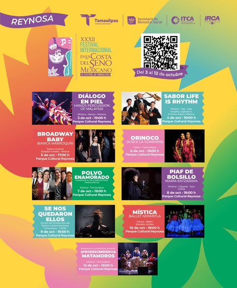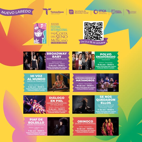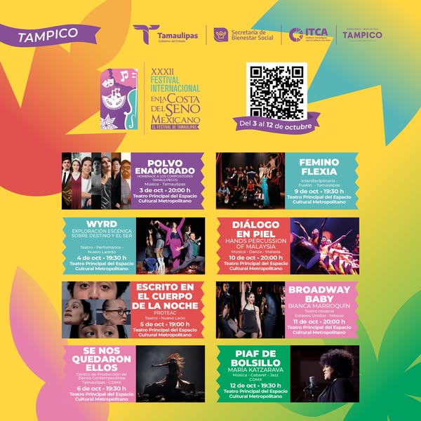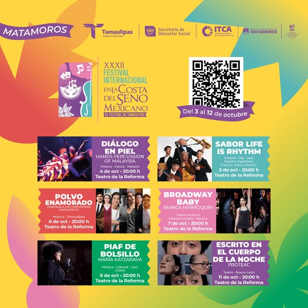 Del 03 al 12 de octubre, los teatros principales de Matamoros, Nuevo Laredo, Reynosa, Tampico y Victoria se encienden con espectáculos imperdibles del Festival Internacional en la Costa del Seno Mexicano.